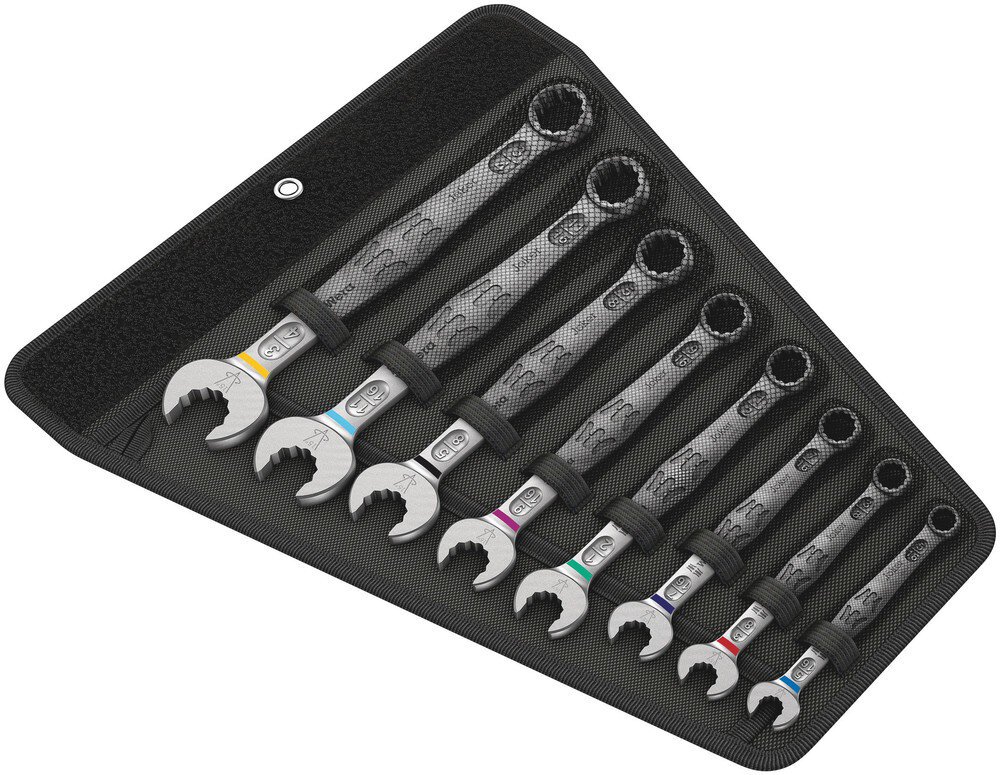 Da die Bauräume bei Schraubarbeiten immer enger werden, sind Werkzeuge notwendig, mit denen die Anwender auch in solchen Situationen erfolgreich arbeiten können. Enge Bauräume erfordern zusätzliche Ansetzpunkte des Werkzeugs. Lassen sich also Maulschlüssel derart modifizieren, dass sich die Ansetzmöglichkeiten des Werkzeugs erhöhen? Durch die Kombination des um 7,5° geschwenkten Mauls und die Doppelsechskantgeometrie wird eine Verdopplung der Ansetzpunkte erzielt. Bei einer wiederholten 180°-Drehung des Schlüssels um die Längsachse während des Schraubens gibt es vier Ansetzmöglichkeiten und Muttern bzw. Schraubenköpfe können alle 15° "gepackt" werden. Der Joker 6003 mit seiner pfiffigen Maulgeometrie erweitert das Anwenderspektrum in engen Bauräumen deutlich. Den jeweiligen Ansetzpunkt findet der Joker 6003 nach jedem Wenden sozusagen von selbst. Die schlanke und dennoch robuste Ringseite ist um 15° zur Werkzeugachse abgewinkelt. Durch die hochwertige Oberflächenvergütung wird ein hoher und lang anhaltender Korrosionsschutz erzielt. Mit Werkzeugfinder Take it easy: Farbkennzeichnung nach Größen. Die Joker Taschen sind durch das Klettsystem auf der Rückseite zur Befestigung an Wand, Regal, Werkstattwagen und am Wera 2go System geeignet.