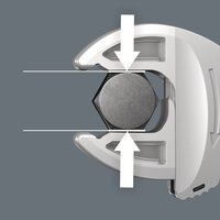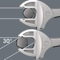 Selbstjustierender Doppelmaulschlüssel für Sechskant-Schraubenköpfe bzw. -Muttern mit Schlüsselweite 7-10 und 10-13 (metrisch) bzw. 1/4"-3/8" und 7/16"-8/16" (zöllig). Durch die stufenlos und parallel geführten Backen werden mehrere Maulschlüssel-Einzelabmessungen ersetzt. Die benötigte Größe stellt sich beim Ansetzen an der Sechskant-Mutter oder -Schraube stufenlos von selbst ein. Der integrierte Hebelmechanismus klemmt die Sechskant-Schraube bzw. -Mutter zwischen den Backen sicher ein, was die Gefahr des Abrutschens und der Beschädigungen deutlich verringert. Für das schnelle und durchgängige Schrauben ohne Absetzen sorgt die Ratschenfunktion. Durch die Nutzung der Eckweiten-Prismen ist ein Rückschwenkwinkel von nur 30° realisierbar. Ratschenfunktion und Eckweitenprisma ermöglichen das Arbeiten auch in engen Bauräumen. Der verstellbare Doppelmaulschlüssel Joker 6006 mit Ratschenfunktion ist das universelle Schraubwerkzeug. Selbstjustierend. Zupackend. Ratschend.