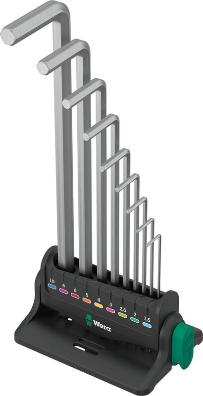 9 gestellverchromte Winkelschlüssel mit Hex-Plus Vorteil gegen rundgedrehte Schrauben sorgen für ein solides Werkzeugsortiment für Innensechskantschrauben. Praktische Aufbewahrung im Rack zum Hinstellen auf den Tisch oder zur Befestigung an der Wand. Im Rack integrierter Clip, der für für den mobilen Einsatz entnommen werden kann. Das Rack enthält obendrein einen cleveren abnehmbaren Magnetisierer, mit dem Schrauben und auch Werkzeugspitzen magnetisiert (und entmagnetisiert) werden können; so muss die Schraube nicht mehr mühsam mit der zweiten Hand festgehalten werden.