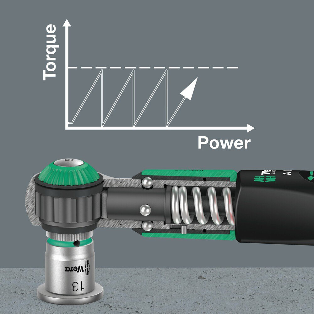 Drehmomentschlüssel mit Überrutschmechanik. Nach Erreichen des eingestellten Drehmomentwertes kann das Werkzeug nicht überzogen werden, so dass das Aufbringen eines zu hohen Drehmomentes ausgeschlossen ist. Einstellbereich von 2 bis 12 Nm für kontrollierten Rechts- und Linksanzug. Einfache Einstellung und Sicherung des Vorgabewertes: Das hör- und fühlbare Einrasten bei Erreichen der Skalenwerte erleichtert zusätzlich die sichere Einstellung des gewünschten Drehmomentwertes. Mit Torque Lock Funktion zur Nutzung als Standardknarre ohne Drehmomentfunktion. Max. Bruchdrehmoment des ¼" Vierkant gemäß DIN 3122. Der Rückholwinkel beträgt nur 5°, so dass die Knarre auch in engen Arbeitssituationen eingesetzt werden kann. Kann somit auch für Drehwinkel-Anwendungen genutzt werden.