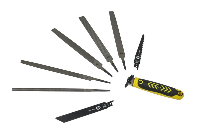 • Satzinhalt: ein einzigartiger Griff mit Schnellwechselvorrichtung, fünf Feilen in je 8 Zoll/200 mm (rund, halbrund, flach, dreikant, alle Hiebnummer 2), außerdem eine Raspel, zwei Säbelsägeblätter (7 TPI und 24 TPI), sowie eine Rolltasche aus Stoff