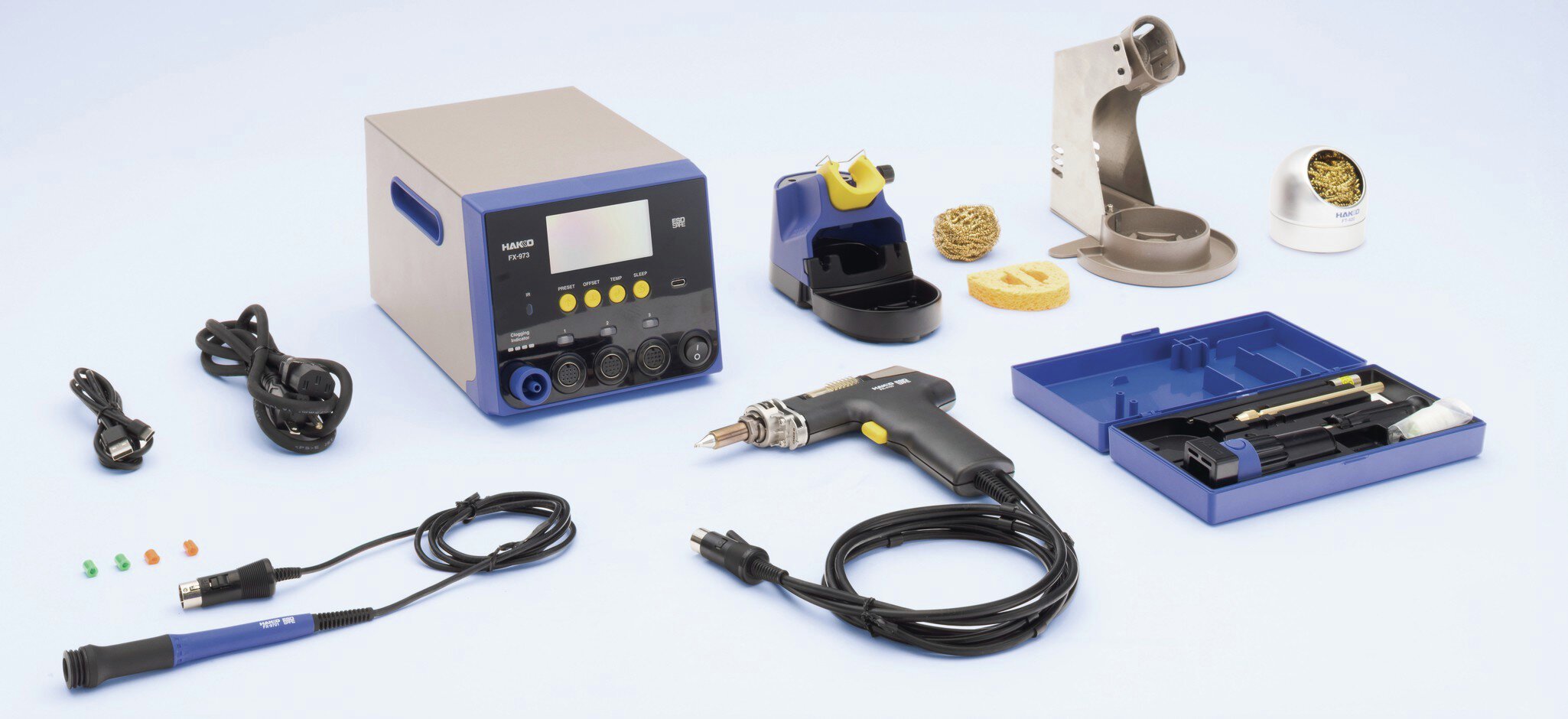 | Lieferumfang | • FX 973 Dreifach-Reworksystem inkl. Netzkabel • FX 9701-81 Lötkolben • FH 215-81 Werkzeughalter inkl. Zubehör • FR 4103-81 Entlötpistole • FH 410-82 Ablageständer, inkl. Zubehör • C 5061 Werkzeugkasten inkl. diversen Zubehör • B 5385 USB Kabel |