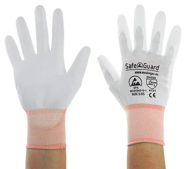 Tauchen Sie ein in ultimativen Schutz und Komfort mit den SafeGuard ESD-Handschuhen. Das weiß-orange Design mit beschichteten Handflächen vereint Stil und Funktionalität auf höchstem Niveau. Hergestellt aus hochwertigem Nylon bieten sie ein angenehmes und komfortables Tragegefühl, das seinesgleichen sucht. Die nahtlose Verarbeitung sorgt für eine perfekte Passform und maximale Bewegungsfreiheit. Dank ihrer atmungsaktiven Eigenschaften sind sie ideal für längere Tragezeiten geeignet. Die Handschuhe entsprechen den strengen Anforderungen der DIN EN 61340-5-1 und sind nach EN 388 zertifiziert (Prüfnummer: 113x). Mit einem Ableitwiderstand von 10⁷ - 10⁸ Ohm halten diese Handschuhe elektrostatische Entladungen zuverlässig in Schach. Die Handschuhe sind zu 100% silikonfrei und werden inklusive Verpackung geliefert, die mit dem CE-Kennzeichnung, dem SafeGuard Logo und der ESD Kennzeichnung versehen ist. Sichern Sie sich jetzt die SafeGuard ESD-Handschuhe und profitieren Sie von erstklassigem Schutz und höchstem Tragekomfort. Zeigen Sie Ihre Professionalität und Expertise mit jedem Handgriff - mit SafeGuard.
