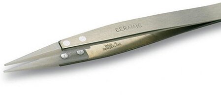 Präzisionspinzette mit Keramikspitz und geriffeltem Fingerprofil für sicheren Halt.