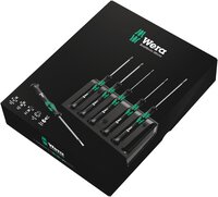 Hochwertiger Wera Micro Schraubendrehersatz für feinmechanische Verschraubungen. Durch Abstützen der Hand auf der Drehkappe und durch die Schnelldrehzone unterhalb der Drehkappe ist blitzschnelles Zwirbeln möglich. Zeitintensives Umgreifen entfällt. Kraftzone mit integrierten Weichzonen sorgt für die Übertragung hoher Löse- und Anzugsmomente. Präzisionszone für den richtigen Drehwinkel bei Justierarbeiten. Die Wera Black Point-Spitze bietet Passgenauigkeit und optimierten Korrosionsschutz. Inklusive praktischem Rack zur übersichtlichen Aufbewahrung der Schraubendreher.