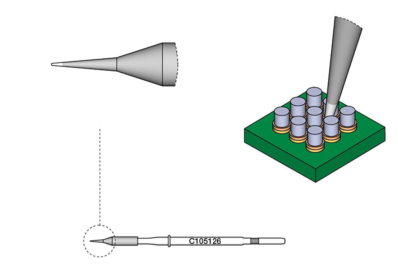 Die Lötspitzen der Serie C105 sind die kleinsten Spitzen der JBC-Serien und eignen sich hervorragend zum Löten und Reparieren sehr kleiner Bauteile. Diese sind kompatibel mit den NT105 und NP105 Nanohandstücken