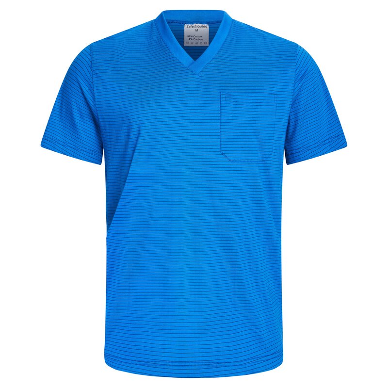 With the ESD T-shirt from SafeGuard, you are ideally equipped for the ESD-protected work area. The royal blue shirt with V-neck and breast pocket is suitable for both men and women. Thanks to the Oeko Tex certification, you can not only rely on protection against electrostatic discharge, but also on the environmental compatibility of the material. The short-sleeved shirt with a typical surface resistance (Rpp) of 10⁵ Ohm - 10⁷ Ohm offers a comfortable fit and optimum functionality in the ESD area. By meeting the requirements of DIN EN 61340-5-1, this shirt is not only stylish but also safe. The combination of 96% cotton and 4% carbon fiber ensures an ideal balance between comfort and protection. With a fabric weight of 150 g/m², the SafeGuard ESD T-shirt is light and comfortable to wear. Show your commitment to safety in the ESD sector with the discreetly placed ESD logo on the sleeve of this high-quality shirt. Invest in quality, style and safety - invest in SafeGuard.