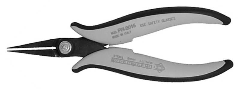 • serrated long nose snipe nose pliers, with rounded outer edges, suitable for handling components in high density areas without damaging them