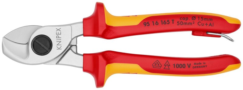 For cutting copper and aluminium cables, solid and stranded. Cuts smoothly and cleanly without crushing. Not suitable for steel wire and hard-drawn copper conductors. Hardened cutting edges with precision grinding. Easy cutting with one-hand operation. With clamping protection. Adjustable screw joint, self-locking. With integrated insulated fastening eye for attaching a fall protection. - Shape: 1 - Cutting value Cu-cable, stranded: 50mm² - Cutting value Cu-cable, stranded: Ø 15mm - AWG: 1 / 0 - Fall protection: Yes - VDE-tested: Yes