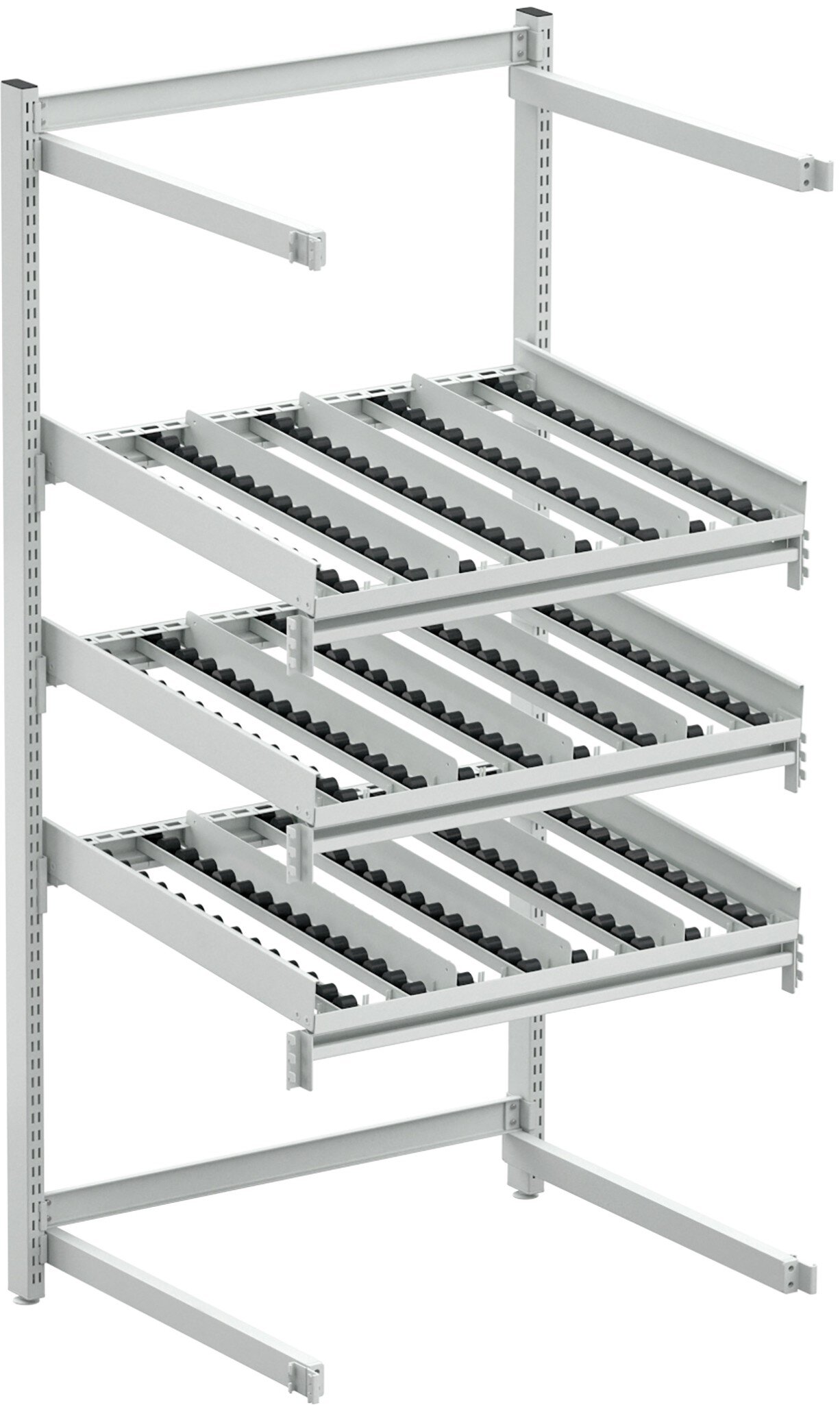 With a rear extension frame you can easily double the storage area. The rack contains 3 levels of rollers that can be adjusted without tools. The roller levels of the lateral extension rack are connected to the roller levels of the FiFo flow rack. Suitable containers: 24 pcs. Treston 1940 visible storage boxes or similar. Each roller level contains 8 pieces of roller profiles and 3 pieces of guide plates. Also suitable for many other container sizes by adding or removing roller profiles and guide plates.