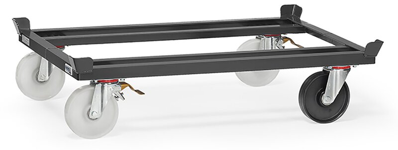 Robust angle steel welded construction, with 4 catch corners. Powder coated anthracite grey RAL 7016. 3 swivel castors with polyamide wheels, hubs with precision ball bearings. 2 swivel castors with total brake in the front, diagonally arranged. 1 castor electrically conductive, wheel centre polypropylene black, hub with precision ball bearing. Underclearance height: 235 mm