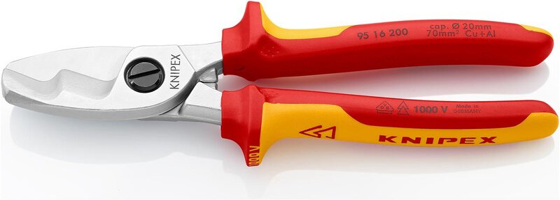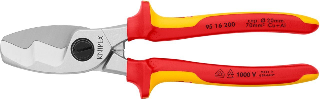 For cutting Cu and Al cables. Not suitable for steel wire and hard-drawn copper conductors. Hardened cutting edges with precision grinding. Cuts smoothly and cleanly without crushing. Adjustable screw joint, self-locking. Low force required due to favourable transmission ratios and special cutting geometry. Pinch protection prevents crushing injuries. Adjustable screw joint, self-locking. - Cutting value Cu-cable, stranded: 70mm² - Cutting value Cu-cable, stranded: Ø 20mm - AWG: 2 / 0 - VDE-tested: Yes