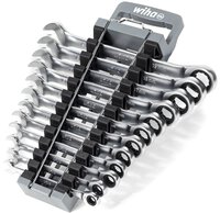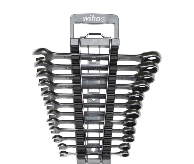 To open strongly tightened screws requires an enormous amount of force. With the ring ratchet open-end wrenches from Wiha, the user can easily get any screw connection open thanks to the leverage effect. In addition, the end with the jaw is ideal for countering screws and nuts. With a jaw position of 15°, the jaw end is perfect for working in tight places. When working with the ring ratchet, the user also has a short return angle thanks to the fine toothing with 72 teeth and, thanks to the double hexagon, maximum convenience when working in confined working environments. It is possible to switch between right-hand and left-hand rotation by simply turning the tool around its own axis. Made of high-quality chrome vanadium steel, the ring ratchet open-end wrenches stand for durability and robustness, not least thanks to their corrosion-resistant and easy-to-clean surface. The set includes the 12 most common sizes from 8 to 19 mm, neatly stowed in a practical holder. The holder can be opened with just one hand to remove the appropriate size, while the non-slip surface provides a strong grip even in oily or wet working situations.