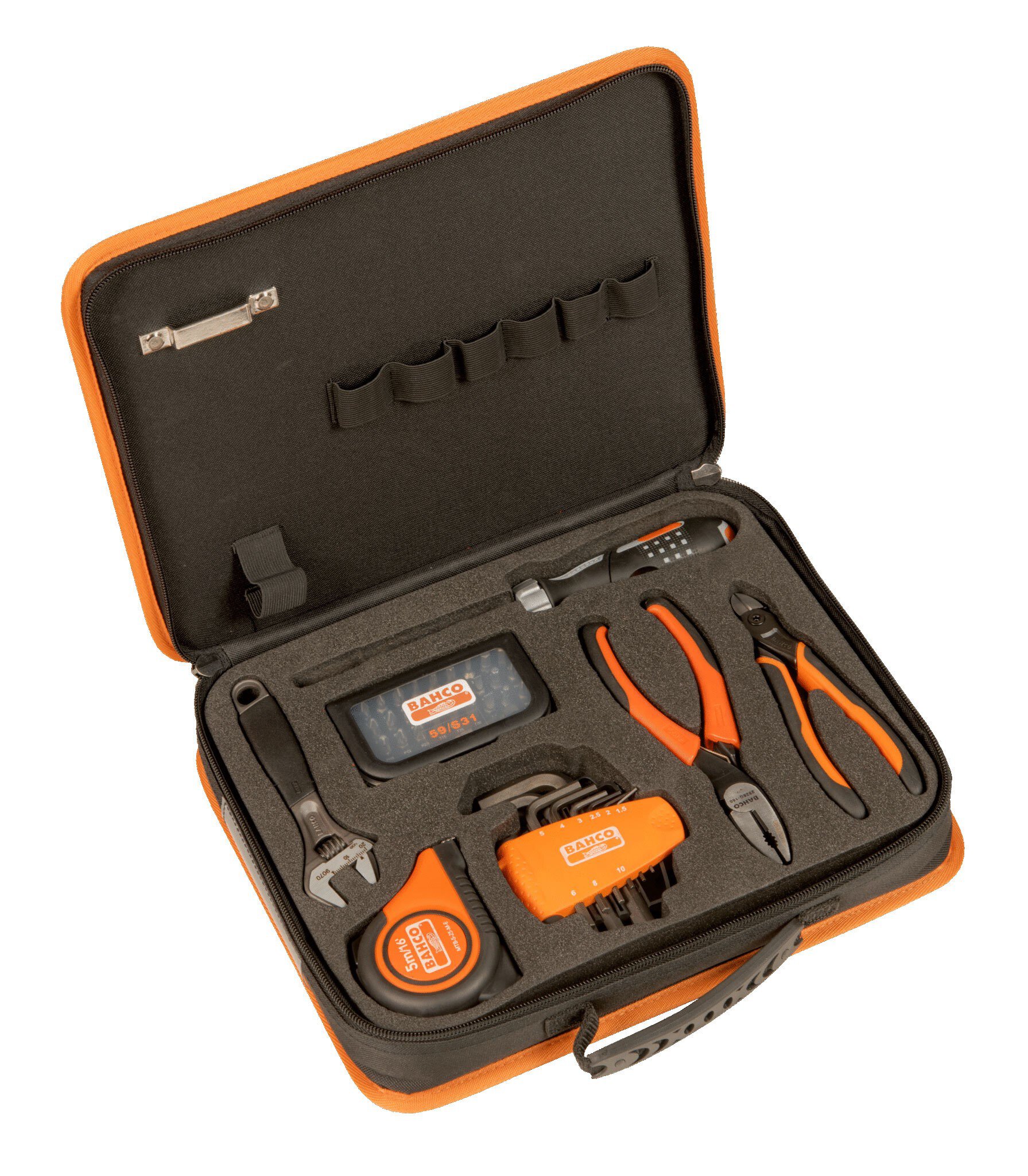 • Foam filled with tools on the button side and several elastic bands for tool organization in the top.