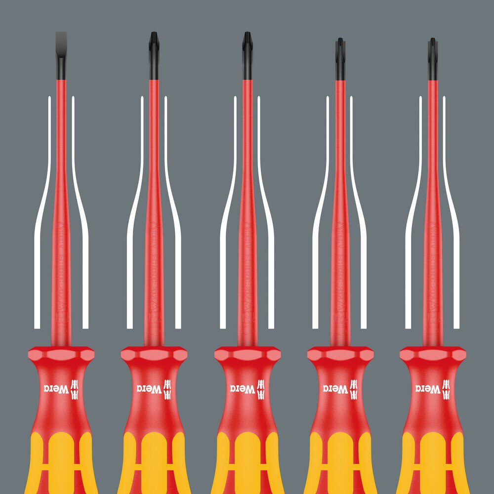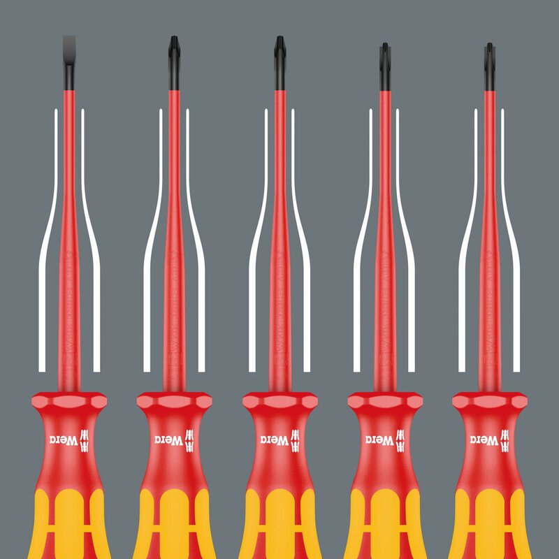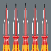 Reduced blade diameter with integrated protective insulation, enabling low-lying screw and spring elements to be reached and operated. Combination profile slotted and Phillips, especially for use with terminal blocks, fuse boxes, switches, relays. Kraftform Plus handle for comfortable ergonomic working, avoiding blisters and calluses. Hard grip zones for high working speed, while soft grip zones guarantee high torque transmission. Roll-off protection prevents annoying rolling away at the workplace.