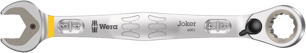 Joker combination ratchet wrench with angled ratchet side and reversible lever. With holding function thanks to metal plate in the jaw, which reduces the risk of losing nuts and bolts. The integrated end stop can prevent the screw head from slipping downwards and enables high torques to be applied. The replaceable metal plate in the jaw secures screws and nuts with extra hard teeth and reduces the risk of slipping. The double hexagon geometry ensures a positive connection with the screw or nut and thus also reduces the risk of slipping. The low swing-back angle of just 30° on the jaw side avoids time-consuming turning of the wrench when screwing. The reversible ratchet mechanism on the ring side with high fine toothing (80 teeth) ensures high flexibility even in tight installation spaces. Audibly precise ratchet mechanism. The robust two-part ratchet element also ensures extreme stability. With 15° angled ratchet side for safe working at high torques. The special forged geometry ensures high torque transmission and high bending stiffness. Manufactured from high-performance chrome-molybdenum steel with nickel-chrome coating for high corrosion protection. With Take it easy tool finder: color coding by size.