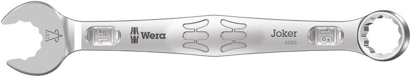 As installation spaces for screwdriving work are becoming increasingly tight, tools are needed that enable users to work successfully in such situations. Tight installation spaces require additional attachment points for the tool. So can open-end wrenches be modified in such a way that the tool's contact points are increased? The combination of the 7.5° swiveled jaw and the double hexagon geometry doubles the contact points. With a repeated 180° rotation of the wrench around the longitudinal axis during screwdriving, there are four tightening options and nuts or screw heads can be "gripped" every 15°. The Joker 6003 with its clever jaw geometry significantly extends the range of applications in tight installation spaces. The Joker 6003 finds the respective starting point automatically, so to speak, after every turn. The slim yet robust ring side is angled at 15° to the tool axis. The high-quality surface coating ensures high and long-lasting corrosion protection. With Take it easy tool finder: color coding according to size.