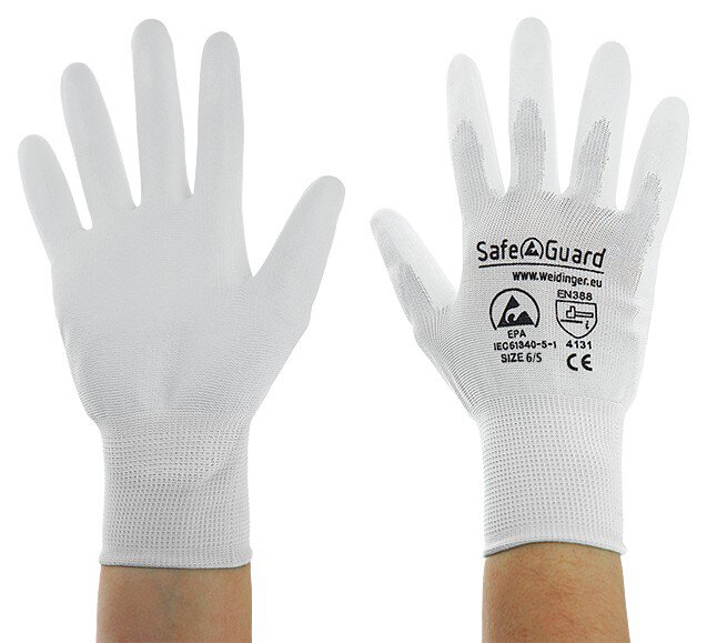 Immerse yourself in ultimate protection and comfort with SafeGuard ESD gloves. The white design with coated palms combines style and functionality at the highest level. Made from high-quality nylon, they offer a pleasant and comfortable feel that is second to none. The seamless finish ensures a perfect fit and maximum freedom of movement. Thanks to their breathable properties, they are ideal for longer periods of wear. The gloves meet the strict requirements of DIN EN 61340-5-1 and are certified in accordance with EN 388 (test number: 113x). With a discharge resistance of 10⁷ - 10⁸ Ohm, these gloves reliably keep electrostatic discharges at bay. The gloves are 100% silicone-free and are supplied with packaging bearing the CE mark, the SafeGuard logo and the ESD mark. Get SafeGuard ESD gloves now and benefit from first-class protection and maximum comfort. Show your professionalism and expertise with every move - with SafeGuard.