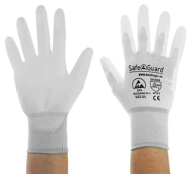 Plongez dans une protection et un confort ultimes avec les gants SafeGuard ESD. Le design blanc avec des paumes enduites allie style et fonctionnalité au plus haut niveau. Fabriqués en nylon de haute qualité, ils offrent une sensation agréable et confortable qui n'a pas son pareil. La finition sans couture assure un ajustement parfait et une liberté de mouvement maximale. Grâce à leurs propriétés respirantes, ils sont idéaux pour un port prolongé. Les gants répondent aux exigences strictes de la norme DIN EN 61340-5-1 et sont certifiés EN 388 (numéro de contrôle : 113x). Avec une résistance de fuite de 10⁷ - 10⁸ ohms, ces gants tiennent en échec les décharges électrostatiques de manière fiable. Les gants sont 100% sans silicone et sont livrés avec un emballage portant le marquage CE, le logo SafeGuard et le marquage ESD. Procurez-vous dès maintenant les gants SafeGuard ESD et profitez d'une protection de première classe et d'un confort maximal. Montrez votre professionnalisme et votre expertise à chaque geste - avec SafeGuard.