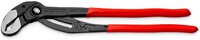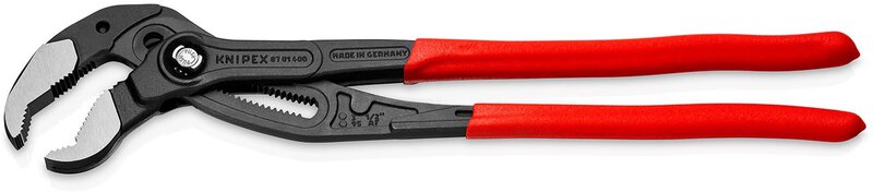 KNIPEX Cobra® XL : Distance de préhension plus grande mais poids beaucoup plus faible que les pinces à tuyaux comparables. Réglage rapide par pression sur un bouton directement sur la pièce, pas de glissement involontaire de l'articulation. Réglage fin pour une adaptation optimale aux différentes tailles de pièces et une position de prise agréable pour la main. Auto-serrage sur les tubes et les écrous : pas de glissement sur la pièce, travail sans effort. Surfaces de préhension avec dents spécialement trempées, dureté des dents env. 61 HRC : préhension durablement sûre grâce à une grande résistance à l'usure. Articulation traversante : grande stabilité grâce au double guidage. La protection contre les pincements évite les blessures par écrasement. - Positions de réglage : 27 - capacité pour écrous, ouverture de clé (pouces) : Ø 3 1/2in - Capacité pour écrous, ouverture de clé (mm) : 95mm - Capacité pour tubes (diamètre) : Ø 90mm