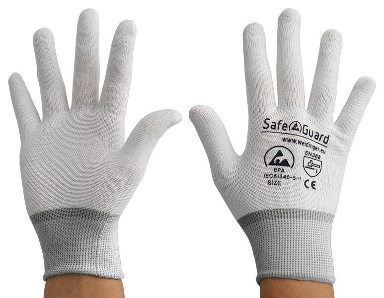 Plongez dans une protection et un confort ultimes avec les gants SafeGuard ESD. Le design blanc et gris sans enduction allie style et fonctionnalité au plus haut niveau. Fabriqués en nylon et en carbone de haute qualité, ils offrent une sensation agréable et confortable qui n'a pas son pareil. La finition sans couture assure un ajustement parfait et une liberté de mouvement maximale. Grâce à leurs propriétés respirantes, ils sont idéaux pour un port prolongé. Les gants répondent aux exigences strictes de la norme DIN EN 61340-5-1 et sont certifiés EN 388 (numéro de contrôle : 113x). Avec une résistance de fuite de 10⁷ - 10⁸ ohms, ces gants tiennent en échec les décharges électrostatiques de manière fiable. Les gants sont 100% sans silicone et sont livrés avec un emballage portant le marquage CE, le logo SafeGuard et le marquage ESD. Procurez-vous dès maintenant les gants SafeGuard ESD et profitez d'une protection de première classe et d'un confort maximal. Montrez votre professionnalisme et votre expertise à chaque geste - avec SafeGuard.