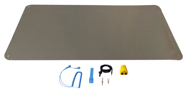 Per equipaggiare un EPA, è necessario posizionare un tappetino da tavolo ESD sotto la postazione di lavoro per garantire che i componenti sensibili non vengano danneggiati dalle scariche elettrostatiche. Il set di tappetini da tavolo ESD di Warmbier comprende anche una spina di messa a terra, una presa di sicurezza, un filo di messa a terra, un cinturino da polso e un cavo a spirale