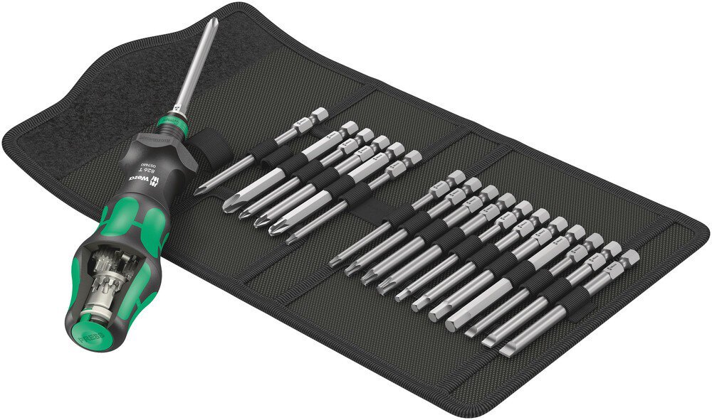 | Contenuto della confezione | 1x 826 T Kraftform Turbo bits supporto manuale con mandrino a cambio rapido Rapidaptor: 1/4 "x146 mm 3x 851/4 punte Z: PH 1x89 mm, PH 2x89 mm, PH 3x89 mm 3x 855/4 punte Z: PZ 1x89 mm, PZ 2x89 mm, PZ 3x89 mm Punte TORX® 5x 867/4 Z: TX 10x89 mm, TX 15x89 mm, TX 20x89 mm, TX 25x89 mm, TX 30x89 mm 4x 840/4 punte Z: 3x89 mm, 4x89 mm, 5x89 mm, 6x89 mm 3x 800/4 punte Z: 0,8x4x89 mm, 1x5,5x89 mm, 1,2x6,5x89 mm |