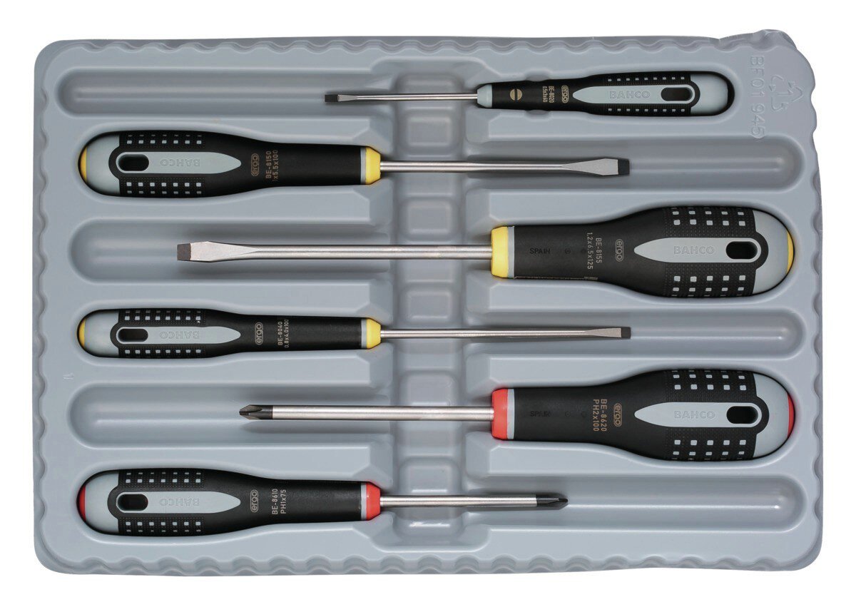 ERGO™ schroevendraaierset voor gleuf- en kruiskopschroeven met rubberen handvat, 6 stuks.