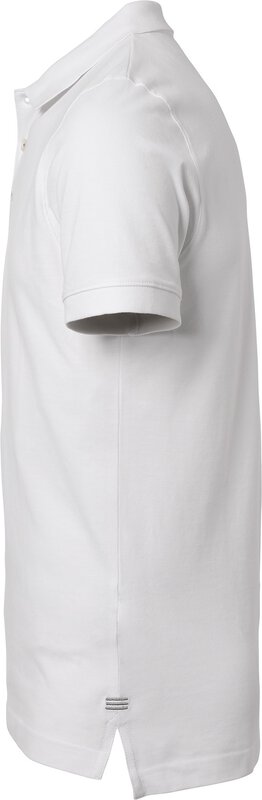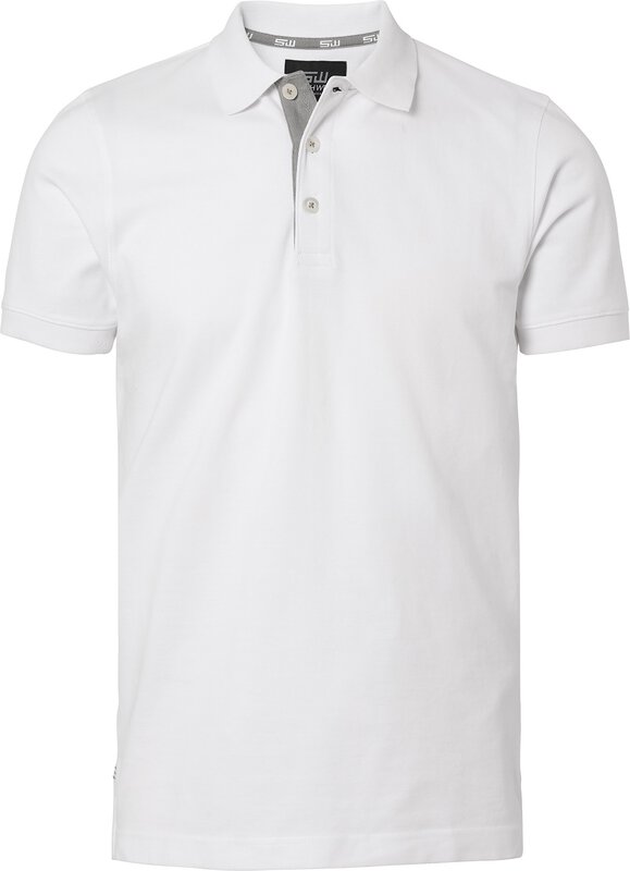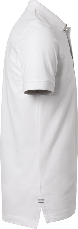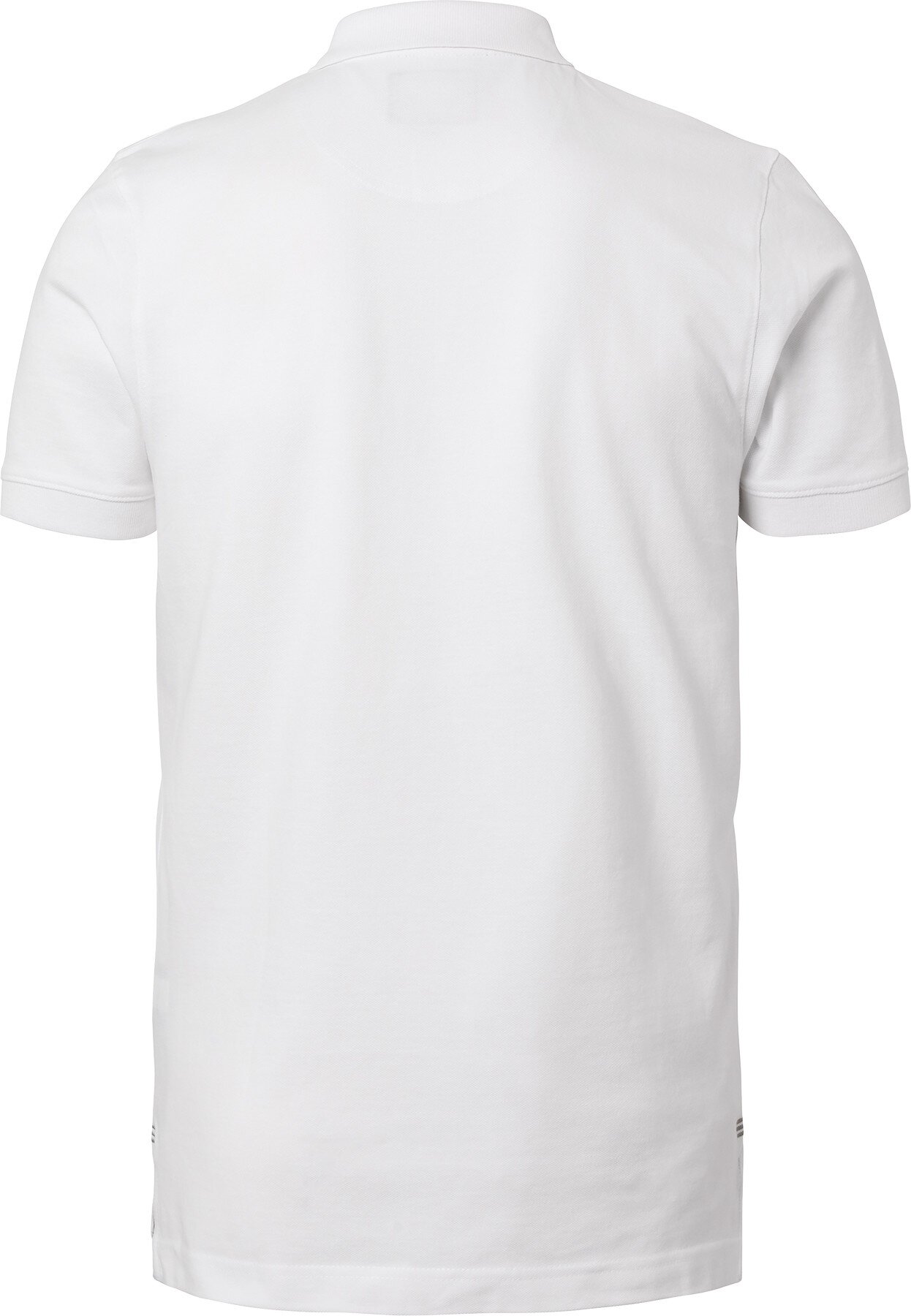 Piqué poloshirt met decoratieve band bij de hals en splitjes. Halve maan naad bij de hals. De sluiting heeft witte knopen en een voering met contrasterend visgraatmotief en subtiel ton sur ton borduursel. Met contrasterend borduursel boven de splitjes.