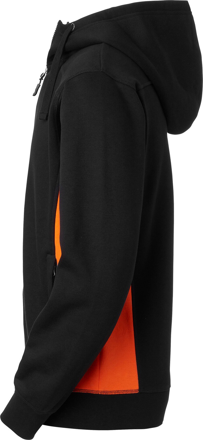 Bluza ze szczotkowanym wnętrzem i kontrastowymi wstawkami po bokach. Dwie przestronne kieszenie z przodu zapinane na zamek. Kaptur z wysokim dekoltem i sznurkiem ułatwiającym dopasowanie. Elastyczny dół i mankiety. Dostępny alternatywny kolor dla lepszej widoczności.