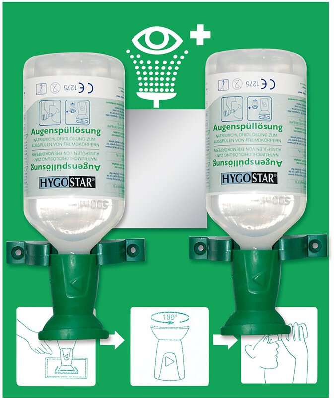w tym 2 butelki do płukania oczu (5 ml, 9% chlorek sodu, szczególnie przeciw ciałom obcym w oku) Uchwyt z tworzywa sztucznego z instrukcją Lustro Śruby do montażu