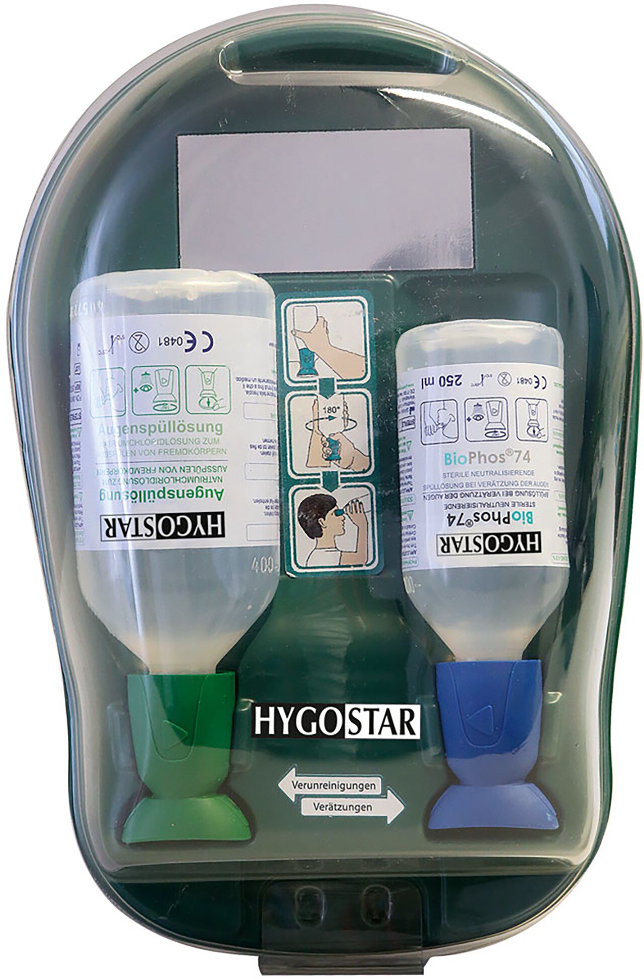W przypadku urazu oka liczy się każda sekunda. Aby można było natychmiast udzielić pierwszej pomocy, bardzo zalecane jest przechowywanie butelek z płynem do przemywania oczu w specjalnym uchwycie ściennym.Dzięki stacji do przemywania oczu płyn do przemywania oczu jest higienicznie przechowywany i w razie potrzeby natychmiast pod ręką. Zapewnia również, że butelki do płukania oczu są dostępne w stałym i łatwo dostępnym miejscu. Stacja do przemywania oczu Eye Care Medidrop II zawiera dwie różne butelki do przemywania oczu do różnych zastosowań: