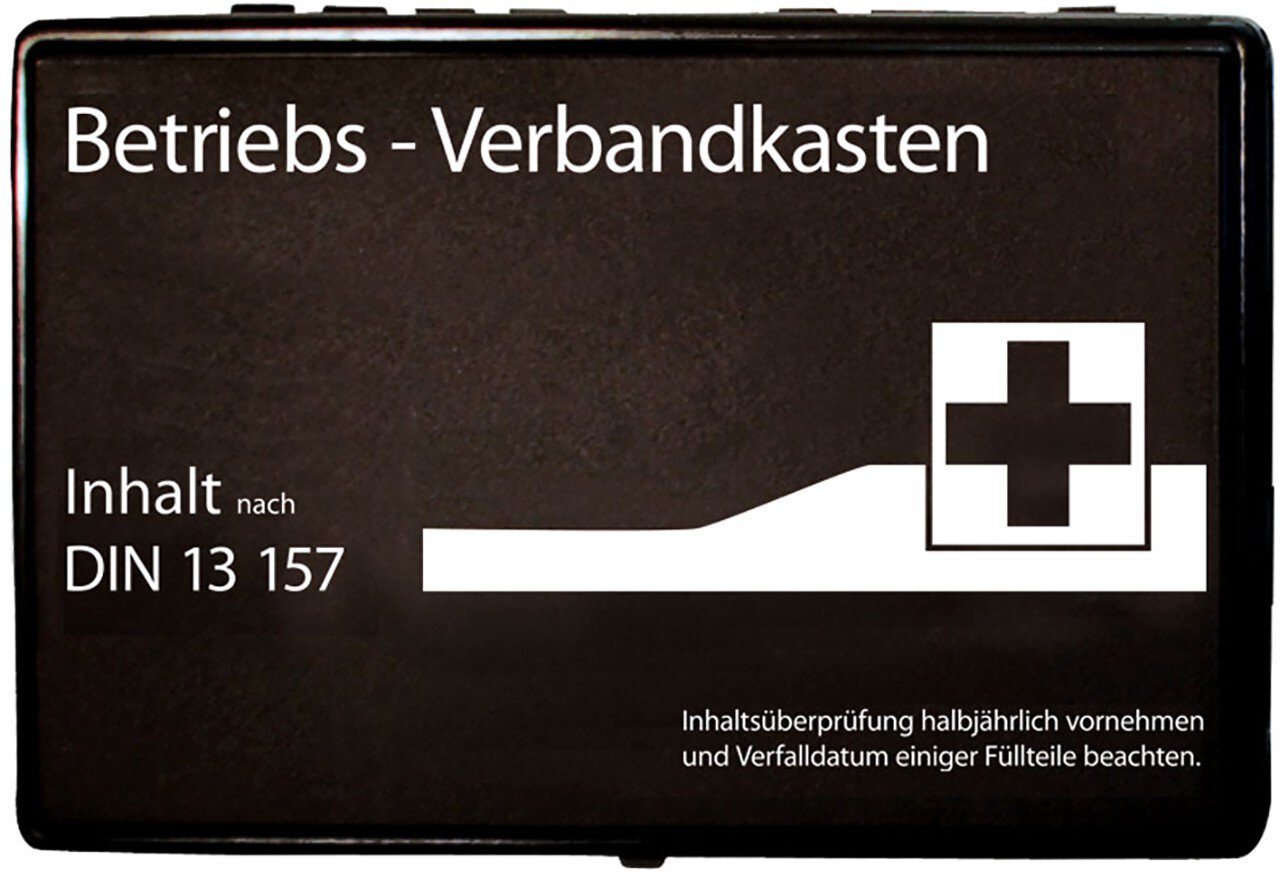 Apteczka pierwszej pomocy, czarna, wyposażenie podstawowe DIN13157 wraz z uchwytem ściennym.