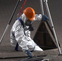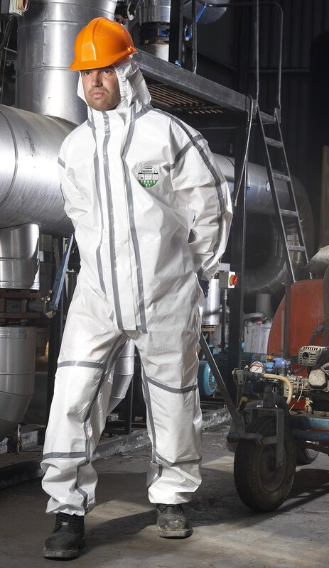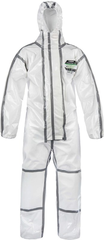 Kombinezon chemiczny z powłoką polimerową, kaptur z gumką na twarz, szczelne mankiety maski, elastyczne zakończenia ramion i nogawek, szwy klejone na gorąco, podwójna osłona zamka błyskawicznego klejona na gorąco, wyjątkowo miękki i elastyczny oraz cichy materiał, dwuwarstwowe nakolanniki dla większego komfortu, ochrona przed licznymi organicznymi substancjami chemicznymi i biologicznymi substancjami niebezpiecznymi, antystatyczność wewnątrz, CE CAT.III, typ 3,4,5+6, odporne na działanie cieczy, pyłu i ograniczonego rozprysku, ochrona przed cząstkami radioaktywnymi wg EN1073-2, EN 14126 - ochrona przed czynnikami zakaźnymi (3B)