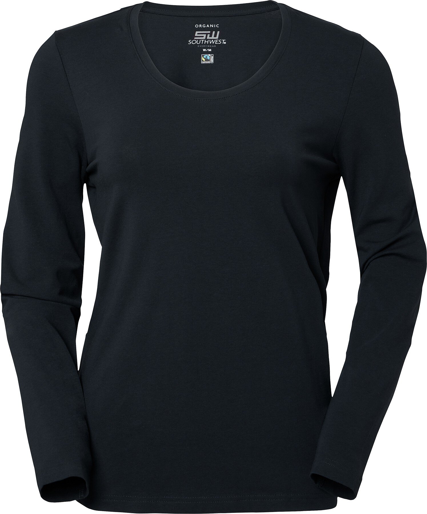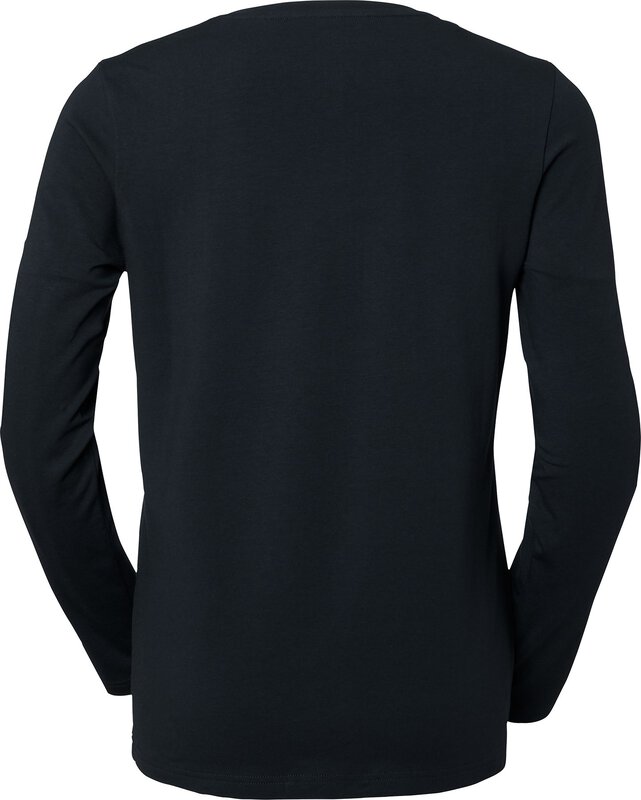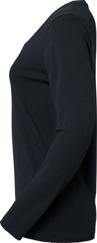 T-shirt z długim rękawem wykonany z bawełny z certyfikatem Fairtrade i elastycznego materiału zapewniającego wygodne dopasowanie. Okrągły dekolt z wąskim ściągaczem i modny damski krój. Kolory z certyfikatem GOTS to biały, granatowy, ciemnooliwkowy, seledynowy, indygo i czarny. Kolor certyfikowany przez OCS to średni szary melanż.