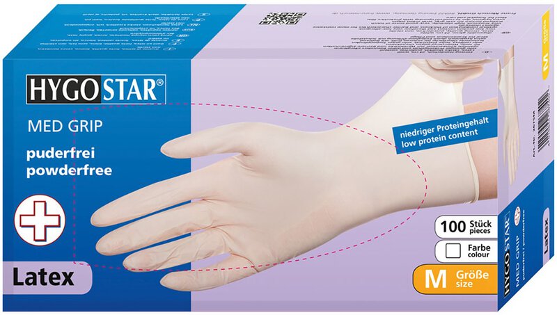 Latexhandschuh Med Grip von Hygostar: Der Latexhandschuh Med Grip von Hygostar: ist ein besonders hautverträglicher Handschuh. Durch den sehr geringen Proteingehalt der nach der Lowry Messmethode (DIN EN 455-3) gemessen wurde, ist der Handschuh sehr für Allergiker geeignet. Er enthält nur noch eine Latexprotein-Konzentration von unter 5 μg/g ! Durch die ideal Kombination der Barriere-Eigenschaften und der Wandstärke besteht ein erhöhter Widerstand gegen Chemikalien. Die zusätzliche Schutzfolie an der Entnahme-Öffnung sorgt für erhöhte Hygiene.