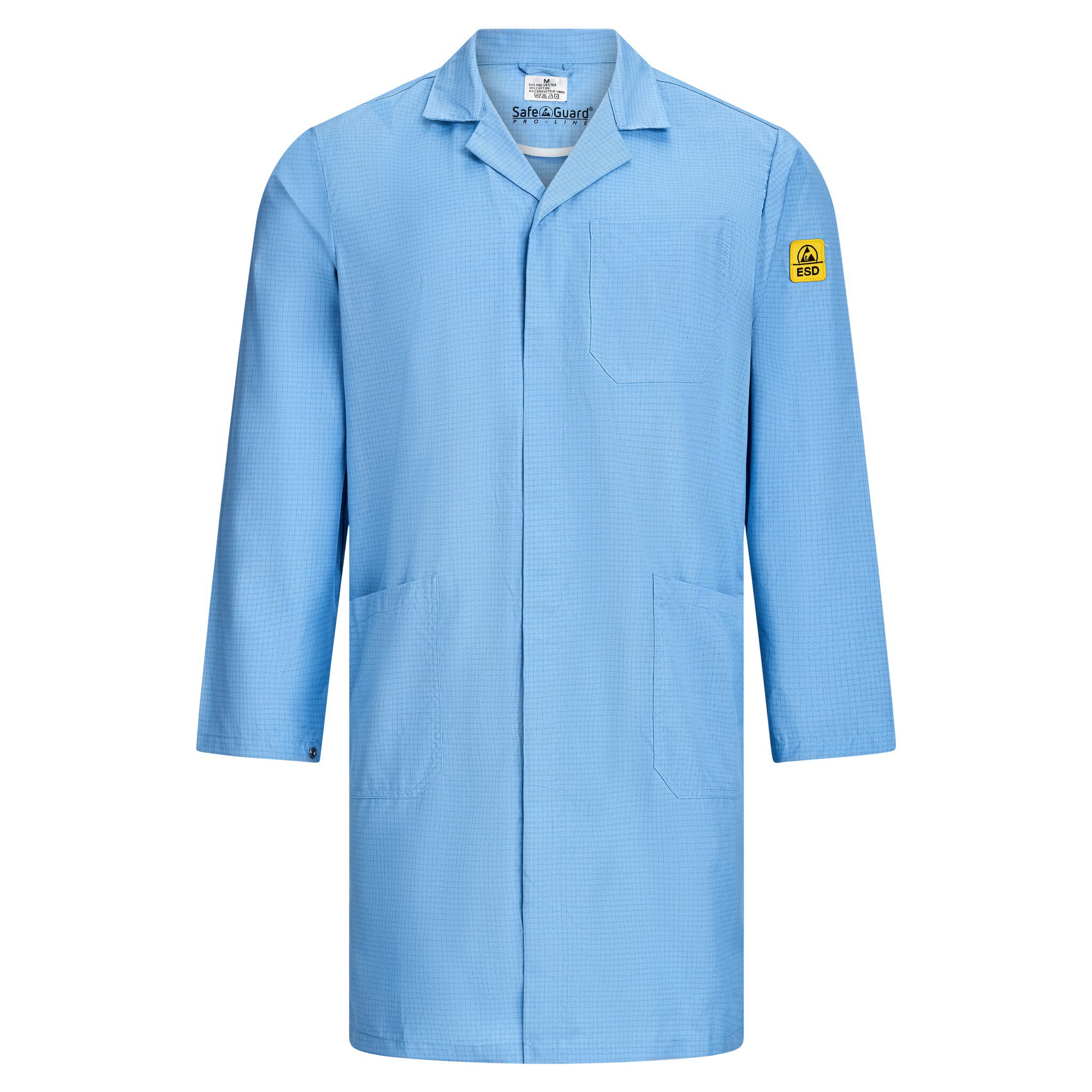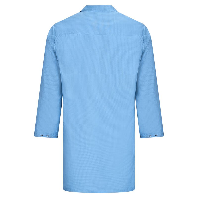 Mit 2 Seitentaschen, Druckknöpfen an den Ärmeln und dem ESD-Logo auf dem Ärmel ist dieser ESD-Kittel nicht nur funktional, sondern auch stilvoll und professionell. Der Reverskragen, die verdeckte Knopfleiste und die Knopfreihe mit Stoffabdeckung verleihen dem ESD-Kittel eine edle Optik, während die langen Ärmel aus 63% PES, 33% Baumwolle und 4% karbonisiertem Garn höchsten Tragekomfort bieten.