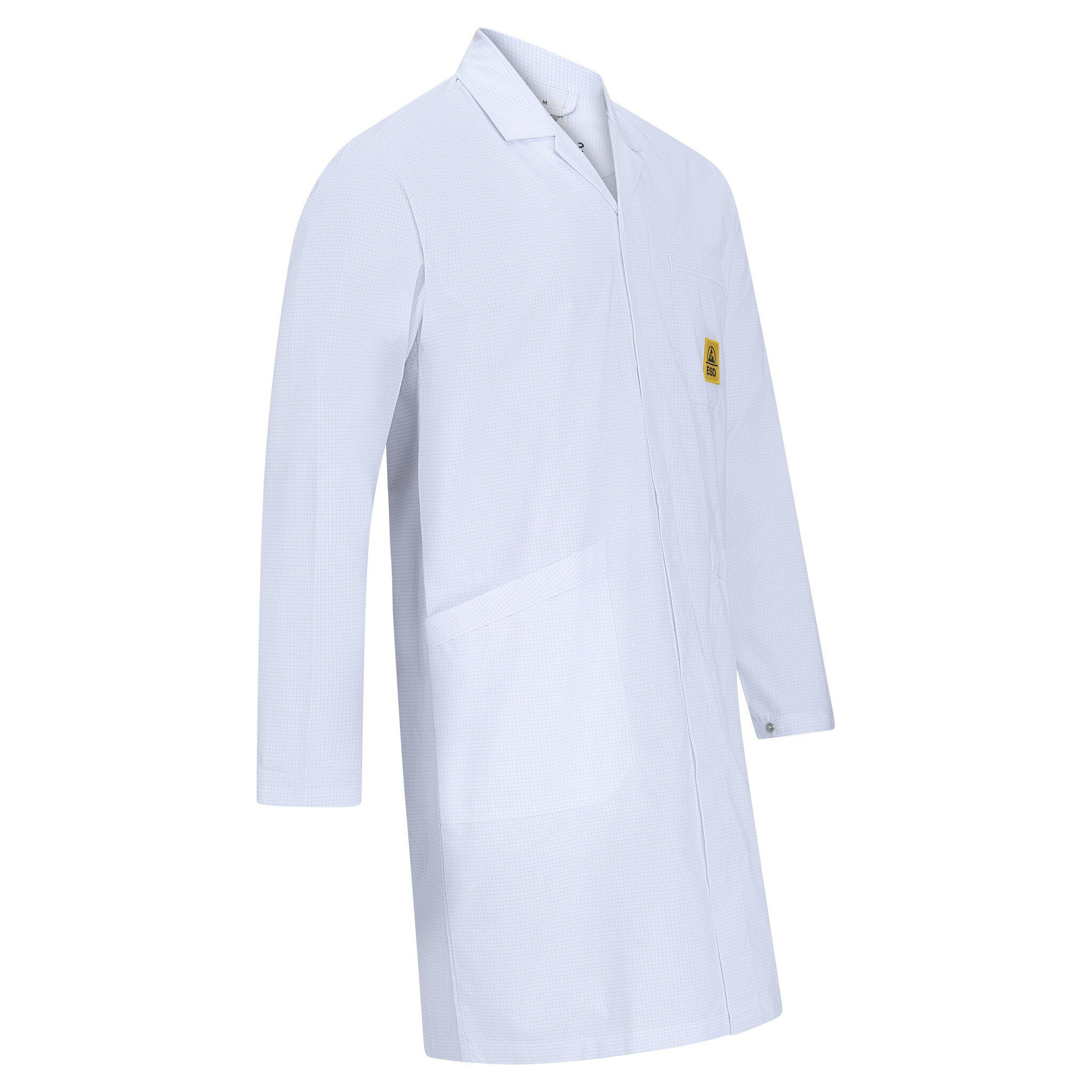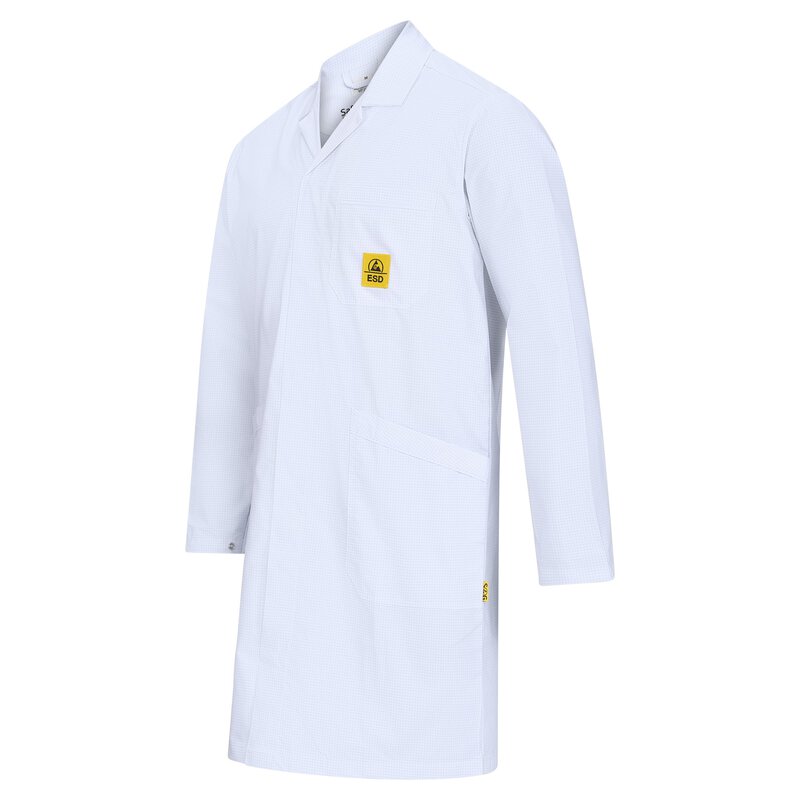 Die praktischen Details wie die 2 Seitentaschen, Druckknöpfe an den Ärmeln, das ESD Logo auf der Brusttasche und die Knopfreihe mit Stoffbedeckung verleihen diesem ESD-Kittel eine professionelle Note. Der Reverskragen und die verdeckte Knopfleiste sorgen für ein elegantes Erscheinungsbild, während die langen Ärmel aus 63% PES, 33% Baumwolle und 4% karbonisiertem Garn Ihnen höchsten Tragekomfort bieten.