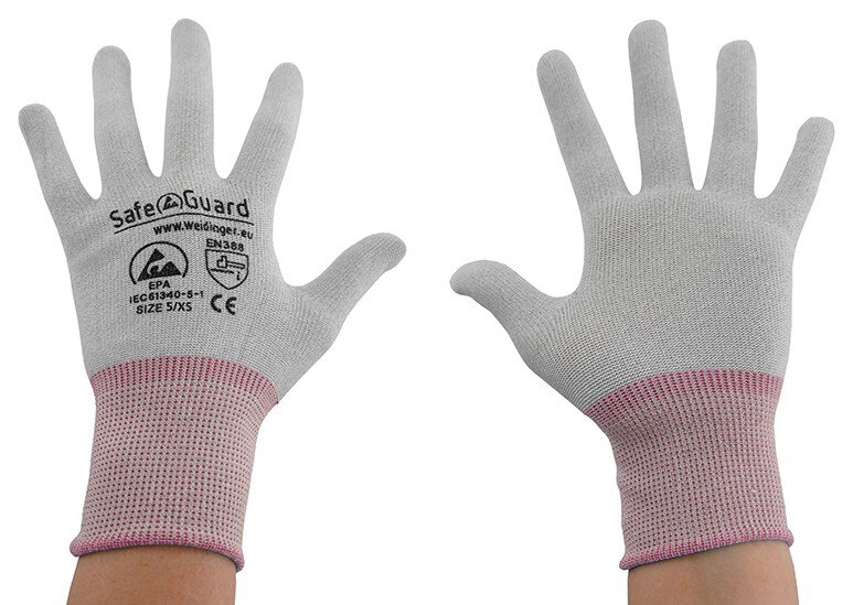 Tauchen Sie ein in ultimativen Schutz und Komfort mit den SafeGuard ESD-Handschuhen. Das grau-beere Design ohne Beschichtung vereint Stil und Funktionalität auf höchstem Niveau. Hergestellt aus hochwertigem Nylon und Carbon bieten sie ein angenehmes und komfortables Tragegefühl, das seinesgleichen sucht. Die nahtlose Verarbeitung sorgt für eine perfekte Passform und maximale Bewegungsfreiheit. Dank ihrer atmungsaktiven Eigenschaften sind sie ideal für längere Tragezeiten geeignet. Die Handschuhe entsprechen den strengen Anforderungen der DIN EN 61340-5-1 und sind nach EN 388 zertifiziert (Prüfnummer: 113x). Mit einem Ableitwiderstand von 10⁷ - 10⁸ Ohm halten diese Handschuhe elektrostatische Entladungen zuverlässig in Schach. Die Handschuhe sind zu 100% silikonfrei und werden inklusive Verpackung geliefert, die mit dem CE-Kennzeichnung, dem SafeGuard Logo und der ESD Kennzeichnung versehen ist. Sichern Sie sich jetzt die SafeGuard ESD-Handschuhe und profitieren Sie von erstklassigem Schutz und höchstem Tragekomfort. Zeigen Sie Ihre Professionalität und Expertise mit jedem Handgriff - mit SafeGuard.