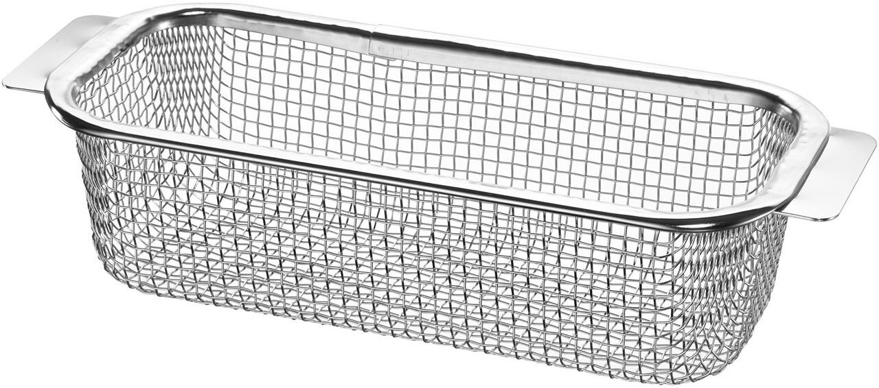 Während der Ultraschall-Reinigung darf das Reinigungsgut nicht auf den Wannenboden gelegt werden, da es aufgrund der Vibrationen der Schwingsysteme zu einem Abrieb zwischen dem Reinigungsgut und der Wanne selbst kommen kann. Es wird daher der Einsatz eines passenden Reinigungskorbes empfohlen. Die BANDELIN-Reinigungskörbe sind so konstruiert, dass sich das Reinigungsgut stets im optimalen Bereich des Kavitationsfeldes (1-2 cm vom Boden entfernt) in der Wanne befindet. Mithilfe eines Korbes kann das Reinigungsgut außerdem komfortabel im Gerät platziert und nach der Reinigung zur Spülung entnommen werden, ohne dass der Anwender mit der Reinigungs- bzw. Desinfektionsflüssigkeit in Kontakt kommt.