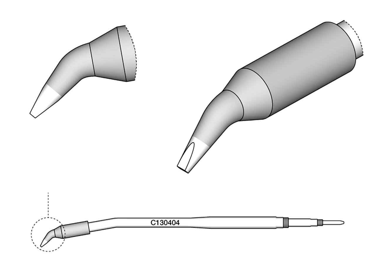 Die Löspitzenserie C130 sind für das Handstück AP130 geeignet und verfügen über gebogene Spitzen, die perfekt an die die Position des Zinndrahts angepasst sind. Die Spitzen können mit Hilfe der Verdrehsicherung am Handstück ausgerichtet werden.