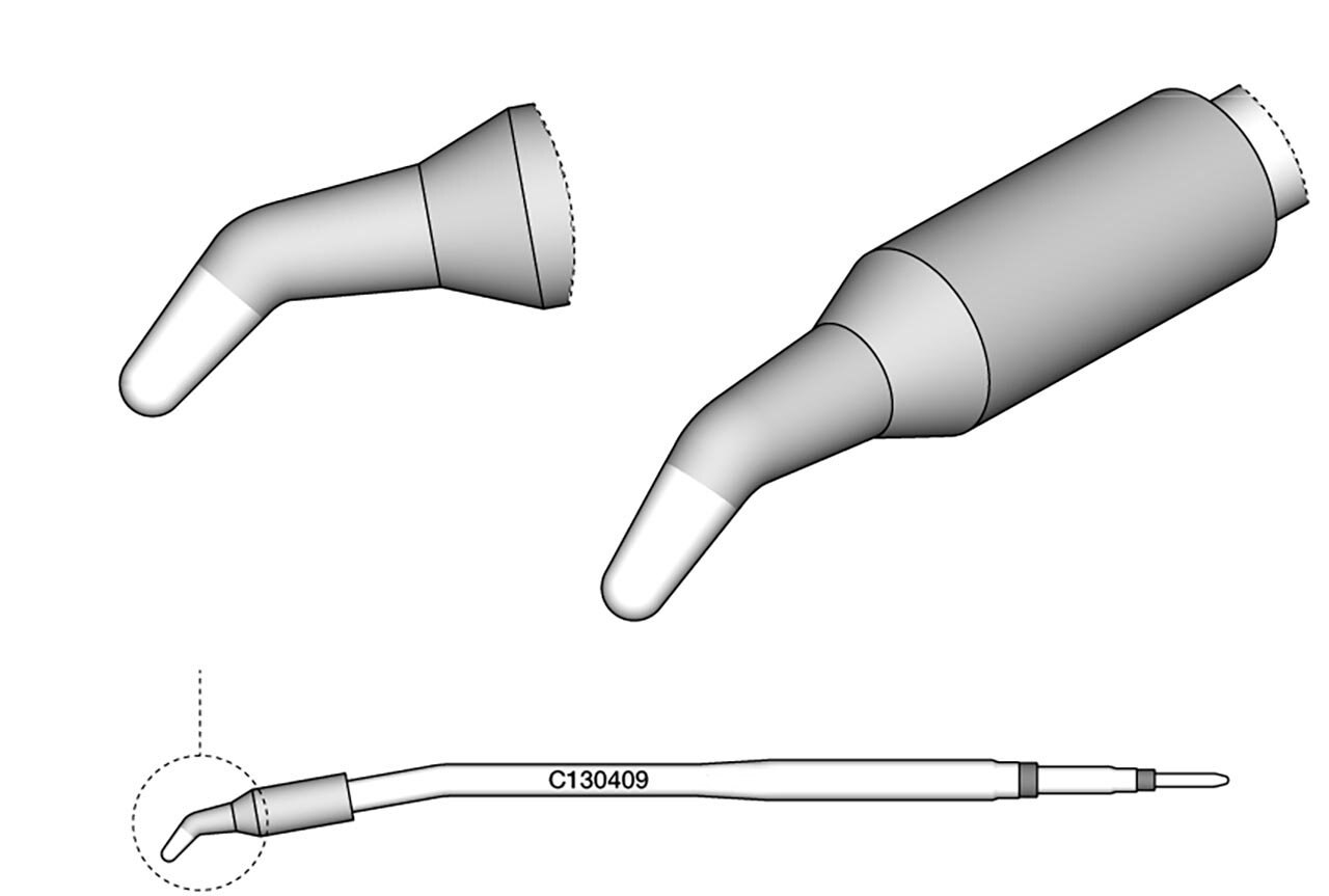 Die Löspitzenserie C130 sind für das Handstück AP130 geeignet und verfügen über gebogene Spitzen, die perfekt an die die Position des Zinndrahts angepasst sind. Die Spitzen können mit Hilfe der Verdrehsicherung am Handstück ausgerichtet werden.