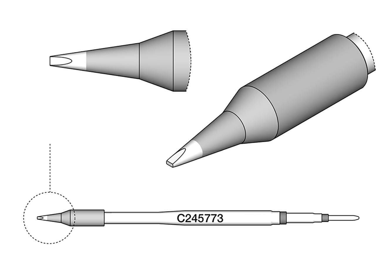 Der C245773 wurde speziell für allgemeine Lötzwecke entwickelt und passt nahtlos in alle T245 Lötkolben-Handstücke, inklusive Standard-, Blue‑Grip- und Stickstoff‑Versionen. Die feine Chisel‑Spitze mit 0,8mm Breite und 0,3mm Dicke eignet sich hervorragend für feine Lötarbeiten an SMD‑Bauteilen und Leiterfach‑Plane oder bei anspruchsvollen Durchgangsbohrungen.