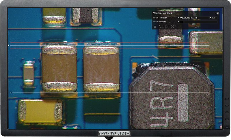 Bei Produkten mit strengen Größen- und Abstandsanforderungen verwenden Sie die Verifikationslinien-App auf Ihrem TAGARNO-Digitalmikroskop. Die intelligente Digitalmikroskop-Software-App ermöglicht es Ihnen, Linien mit benutzerdefinierten Toleranzen über dem Mikroskopbild hinzuzufügen. Mit den genau kalibrierten Verifikationslinien, die überlagert werden, ist es einfach, die Ausgangskontrolle und die visuelle Inspektion der Leiterplatte durchzuführen. Wenn etwas nicht richtig aussieht, machen Sie ein Foto von der Inspektion mit dem Mikroskop-Bedienteil. Für die Verwendung dieser Anwendung sind eine Maus, eine Tastatur und die Mess-App erforderlich.