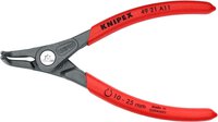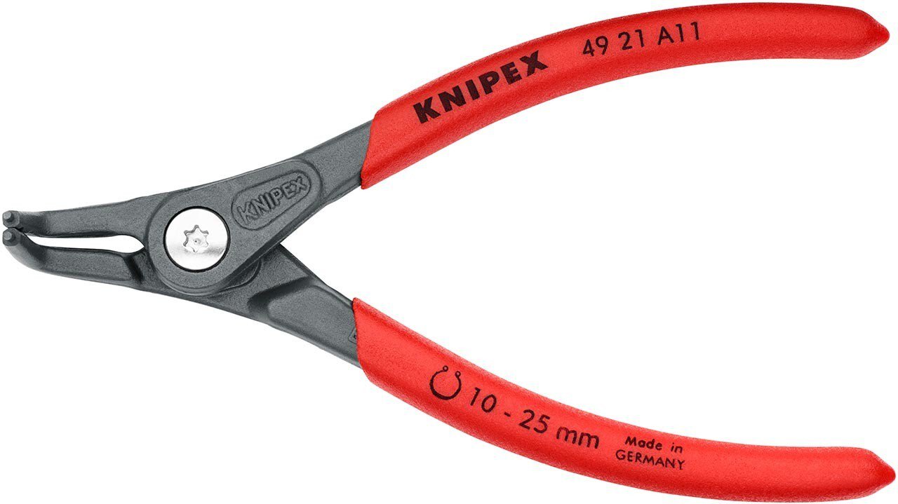 Präzisions-Sicherungsringzange hoch belastbar im Dauereinsatz: bis zu 10-fach höhere Standzeit gegenüber angedrehten Spitzen. Mit eingesetzten Spitzen für sicheres Arbeiten. Große Auflageflächen an den Spitzen: keine Verwindung der Ringe, leichte Montage. Geschraubtes Gelenk: präziser, spielfreier Gang der Zange. Im Gelenk liegende Öffnungsfeder, geschützt und unverlierbar. Rutschhemmender Kunststoffüberzug an den Griffen. gewinkelte Spitzen. - Kapazität für Wellendurchmesser: Ø 10 - 25mm - Form: 2 - Spitzen (Durchmesser): 1,3mm