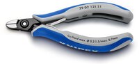 Präzisionszangen für feinste Schneidarbeiten, z. B. in Elektronik und Feinmechanik. Sehr genau geschliffene, scharfe Schneiden mit sehr kleinen Facetten für exakte Schnitte an empfindlichen Elektronik-Bauteilen; auch ohne Facette für bündiges Schneiden. Schneiden zusätzlich induktiv gehärtet, Schneidenhärte ca. 64 HRC. Ca. 20 % weniger Gewicht als konventionelle Elektronikzangen. Geschraubtes Gelenk mit besonders sorgfältig gefertigten Gelenkflächen für gleichmäßige, reibungsarme Bewegung im gesamten Öffnungsbereich. Leichtgängige Doppelfeder für ein sanftes und gleichmäßiges Öffnen. Ergonomisch optimierte Mehrkomponenten-Hüllen. runder Kopf. alle Kanten am Kopf verrundet - reduziert das Risiko von Isolationsbeschädigungen bei Korrekturen an Kabelbäumen. - Form: 0 - Schneidwerte mittelharter Draht (Durchmesser): Ø 1,3mm - Schneidwerte harter Draht (Durchmesser): Ø 0,7mm - Schneidwerte weicher Draht (Durchmesser): Ø 0,2 - 1,7mm - Backenlänge (B): 10mm - Backendicke (am Gelenk) (D): 6,5mm - Kopfbreite (A): 11mm