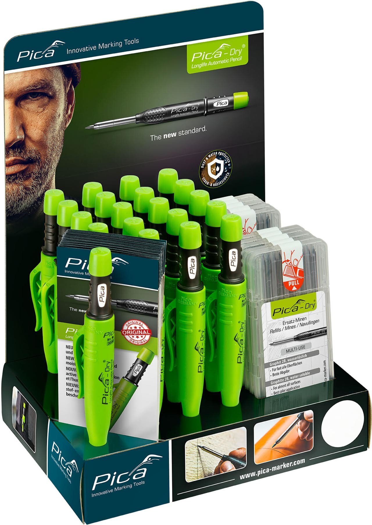 • Inhalt: 20 x 3030 Pica Dry Longlife Automatic Pen ; 10 x 4030 Pica Dry Ersatzminen-Etuis "Graphit" ; 10 Info-Flyer