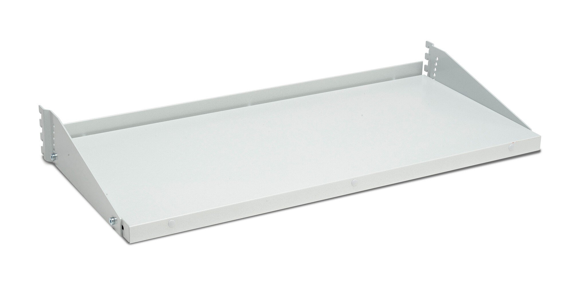 Robuster Stahl-Fachboden mit Schutzkante, vorne. Mit Befestigungspunkten für TNL-Leuchten.
