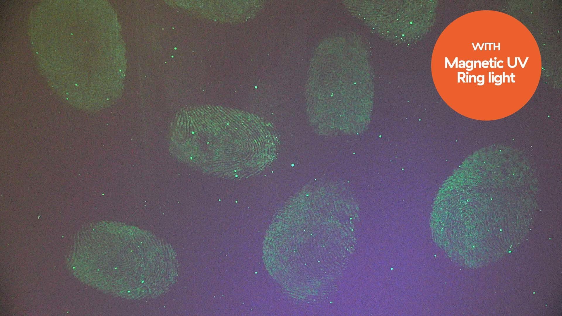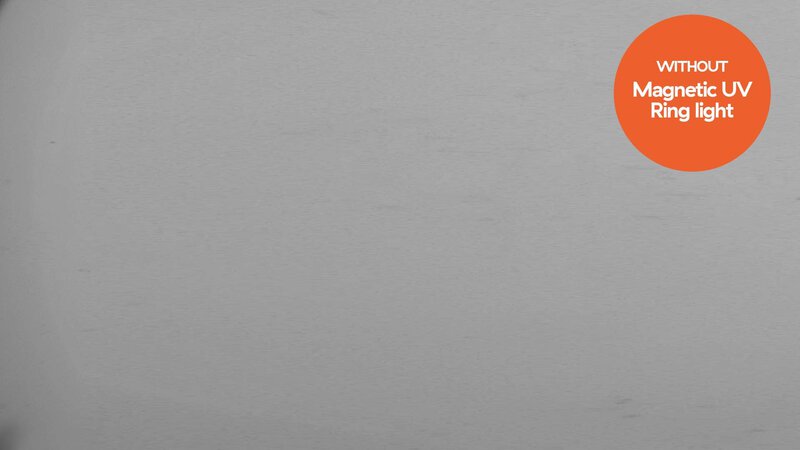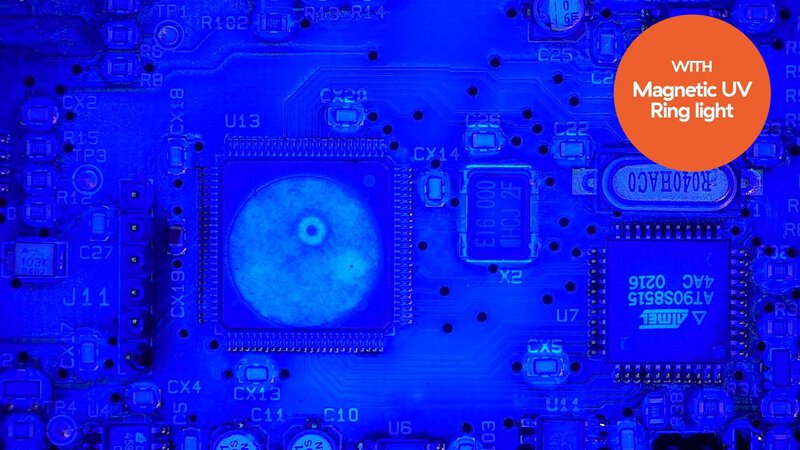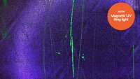 Das UV-Ringlicht ist nicht nur magnetisch, was bedeutet, dass bei der Montage am Mikroskop keine Kabel erforderlich sind. Wir haben auch die separate Steuereinheit eliminiert. Stattdessen verwenden Sie einfach den Controller für das Mikroskop, um die Intensität des UV-Ringlichts sowie die Anzahl der aktiven Segmente und deren Drehung zu steuern.
