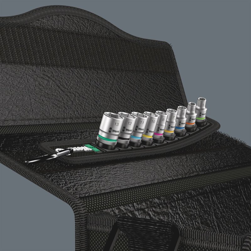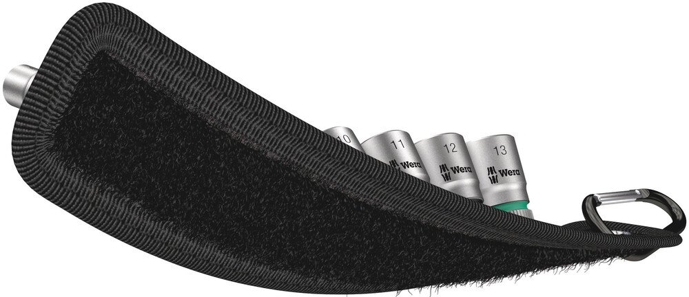 Robuster Textilgurt (Belt) im typischen Wera Design mit 9 Nüssen auf engstem Raum. Ein leichtgängiger Drehmechanismus sorgt für einen sicheren Halt und leichte Entnahme der Nüsse. Mit Take it easy Werkzeugfinder mit Farbkennzeichnung nach Größen - zum einfachen und schnellen Finden des benötigten Werkzeugs. Inklusive Karabinerhaken zur Befestigung an Gürtelschlaufen oder Taschen. Mit Vliesrücken und Klettklebestreifen zur einfachen Befestigung z.B. an Wand, Regal, Werkstattwagen und Wera 2go Werkzeugtransportsystem.